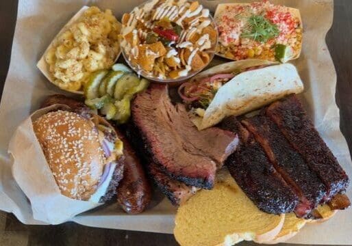 Tray of food at Dayne’s Craft Barbecue in Aledo Texas with brisket ribs sausage OG burger Frito pie beans mac and cheese and street corn